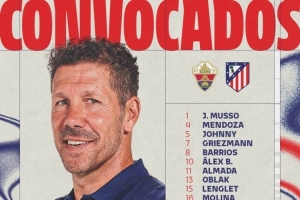 马竞客战埃尔切名单:格列兹曼在列,卢克曼、阿尔瓦雷斯缺席